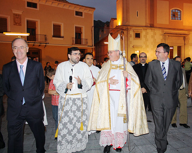 El consejero de Obras Públicas y Ordenación del Territorio, José Ballesta (dcha.), acompañado por el director general de Territorio y Vivienda, Antonio Navarro (izquierda), y el alcalde de Villanueva del Río Segura, José Luis López, inauguraron hoy la fachada de la iglesia de Nuestra Señora de la Asunción, que ha sido financiada con fondos del Ejecutivo regional. Tras la inauguración, el obispo de la Diócesis de Cartagena, José Manuel Lorca Planes (centro), acompañado del párroco del municipio (segundo por la izquierda), bendijo el templo.
