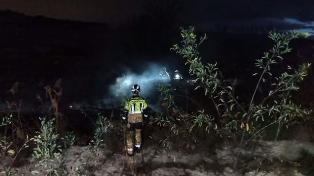 Bomberos del Consorcio de Extinción de Incendios y Salvamento de la Región de Murcia apagan un incendio de vegetación y desechos arrojados allí, declarado en una rambla del paraje Cañada del Royo, en Villanueva del Río Segura.